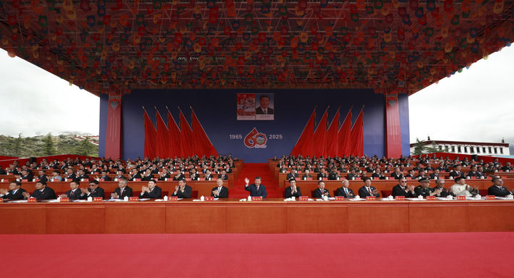 古城拉薩彩旗飄揚(yáng),處處洋溢著節(jié)日的氛圍。雄偉的布達(dá)拉宮下,搭建起藏式風(fēng)格的大會主席臺。主席臺上方中華人民共和國國徽和“西藏自治區(qū)成立60周年慶祝大會”橫幅十分醒目,背景墻上懸掛著大慶會徽和“1965”“2025”字樣,10面紅旗分列兩側(cè)。主席臺對面的布達(dá)拉宮廣場上,身著節(jié)日盛裝的各族群眾從四面八方匯聚到這里,手中揮動著紅旗,匯聚成一片歡樂的海洋。